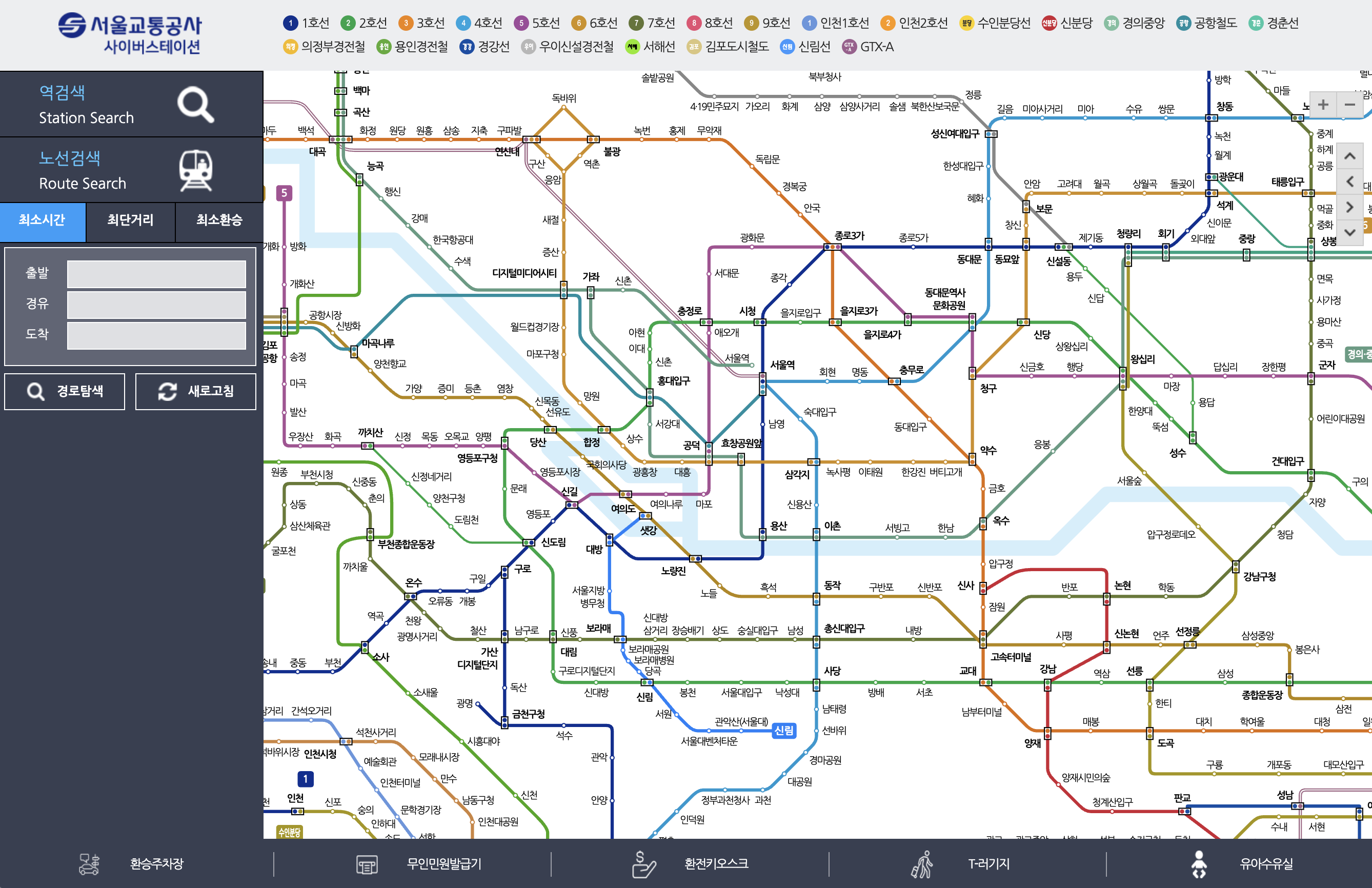 - 출발/도착역 설정 시 최적 경로 안내 (최단 시간, 최소 환승)